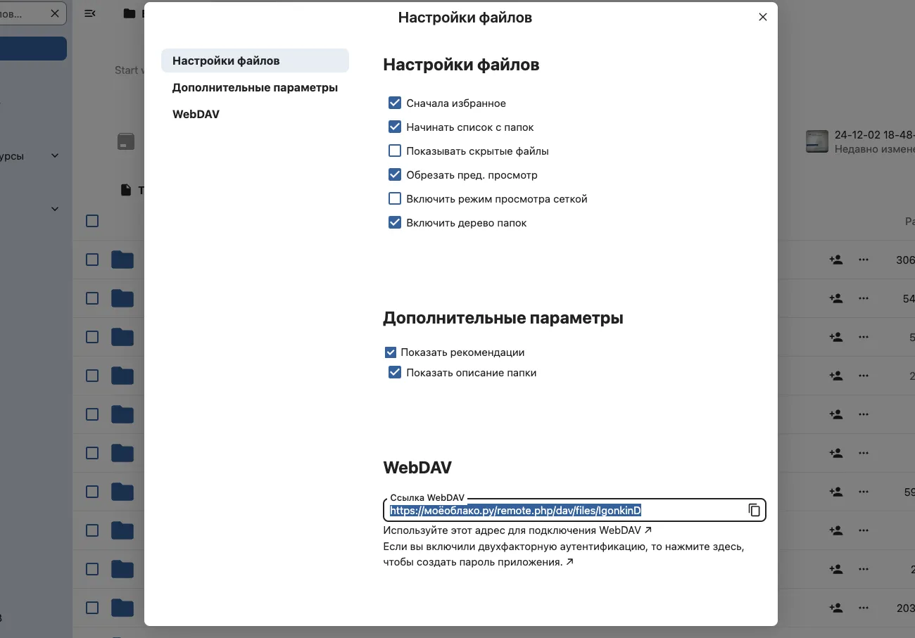 В появившемся модальном окне нужно найти секцию WebDAV. Там будет специфичная для вашего аккаунта ссылка и возможность задать пароль приложения для авторизации. Я настоятельно рекомендую создать именно пароль приложения для настройки синхронизации Obsidian. И вообще всегда, когда идёт речь о подключении приложений к сервисам лучше использовать отдельные приложений, а не общий пароль аккаунта, если это возможно.