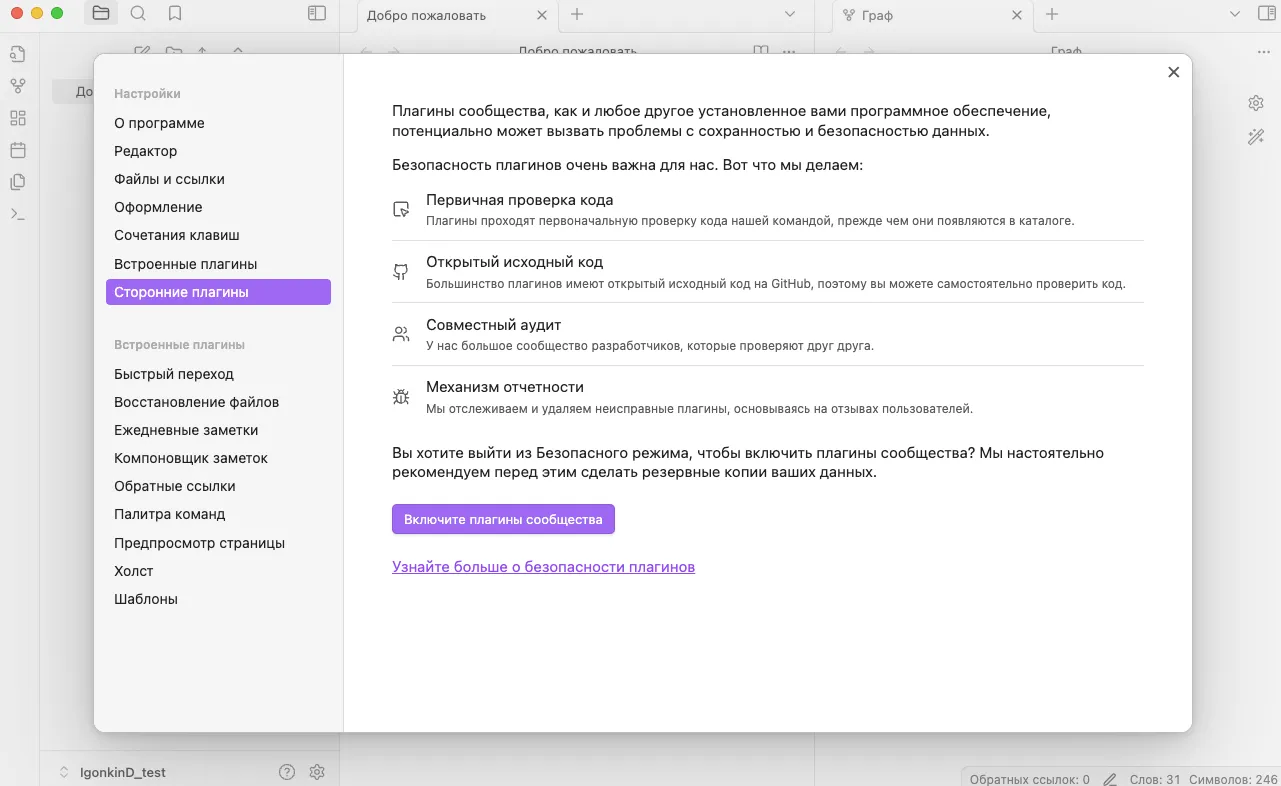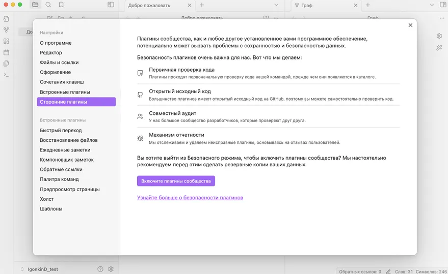 Итак, перейдём к шагам, которые помогут нам настроить синхронизацию заметок между устройствами в Obsidian. Для установки Remotely Save в настройках Obsidian. В настройках нужно найти раздел Сторонние плагины. Там будет кнопка Включить плагины.