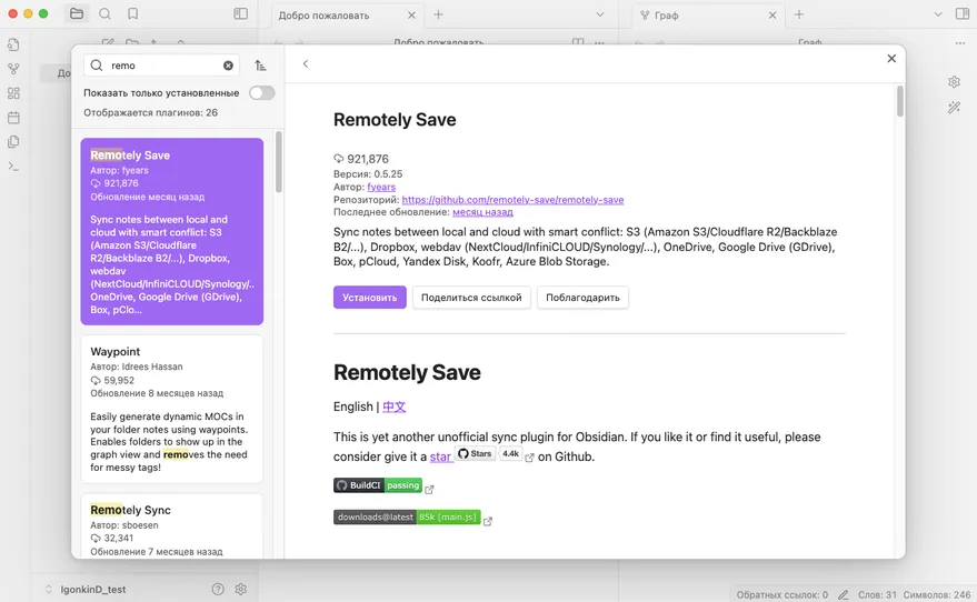 Теперь в разделе Сторонние плагины нужно найти секцию Плагины сообщества и нажать кнопку Обзор. Там и можно будет найти и установить плагин Remotely Save. После установки и включения этот плагин появится в списке установленных.
