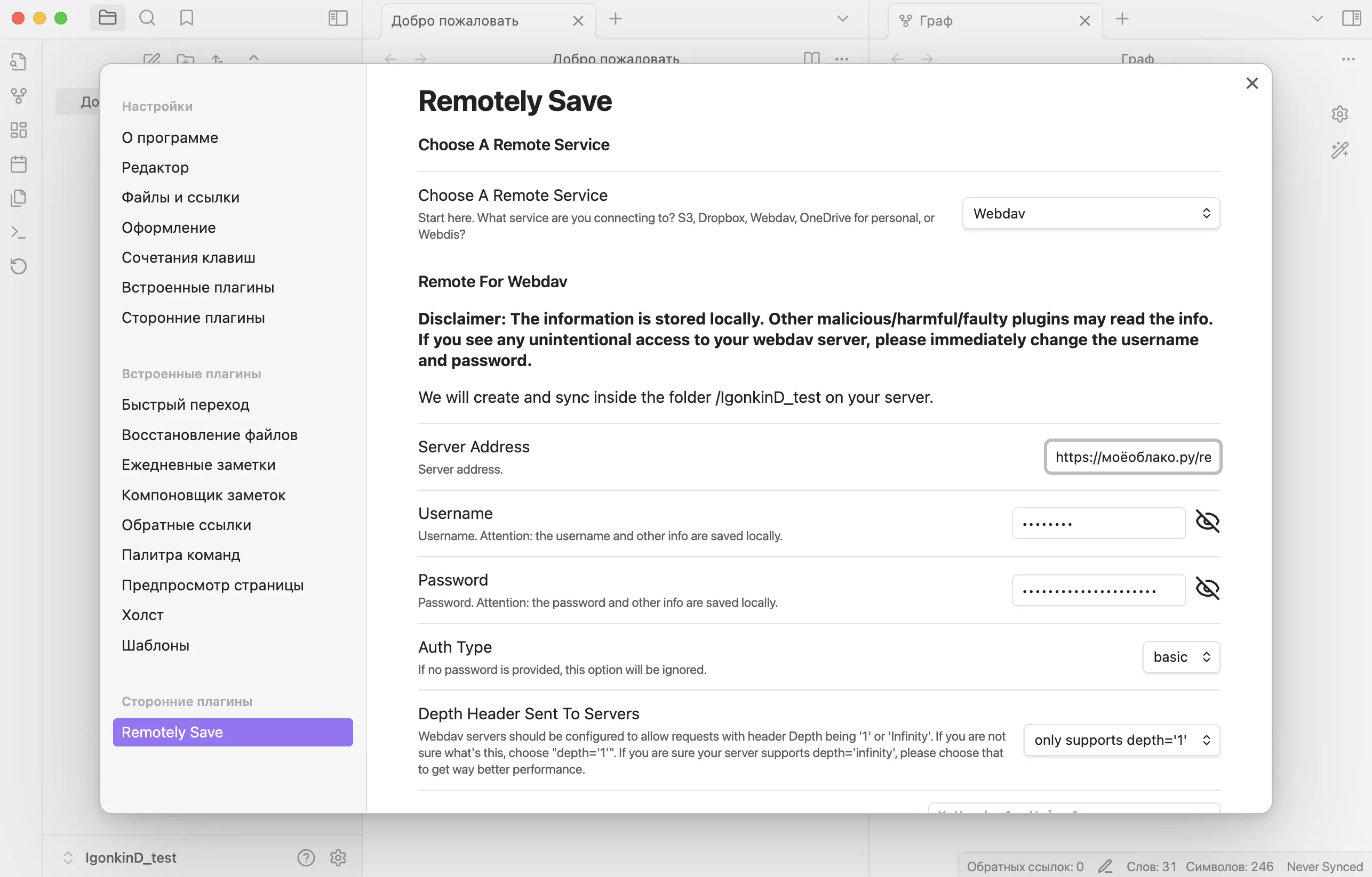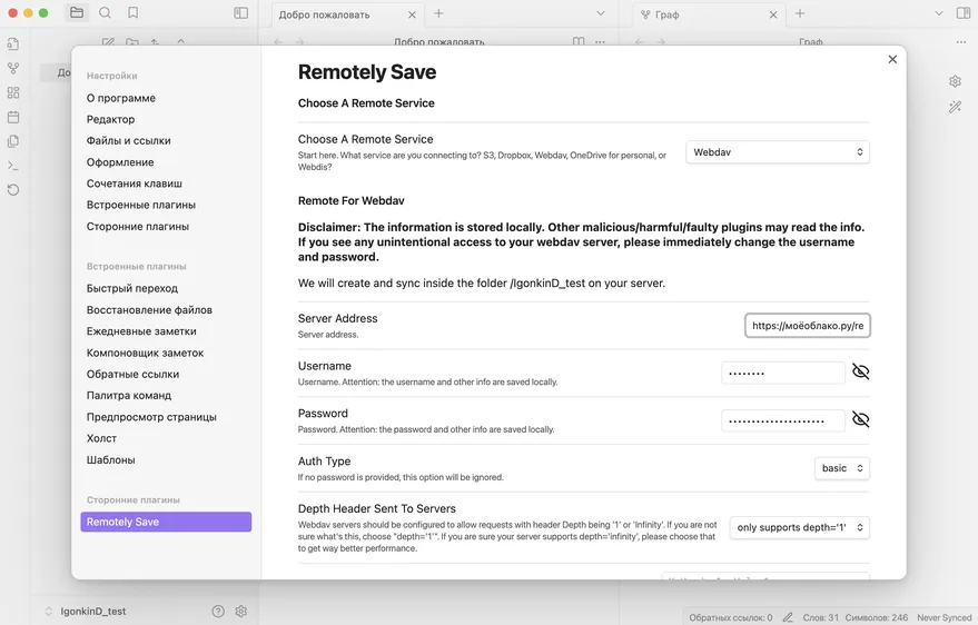 Итак, у нас есть ссылка на WebDAV-хранилище, логин (ваш логин на Nextcloud) и пароль приложения. Возвращаемся к настройке Remotely Save в Obsidian. Там необходимо выбрать среди прочих опций Webav и вводим все эти данные.