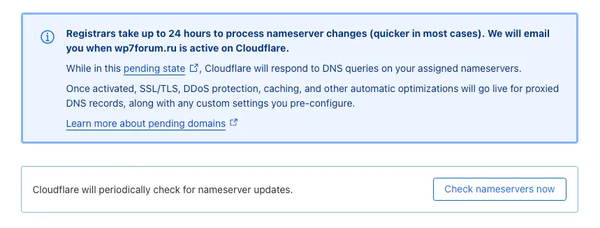 После изменения NS домена подождите от нескольких часов до суток. После того как изменения вступят в силу, Cloudflare автоматически настроит всё необходимое и отправит вам письмо о успешном подключении домена.