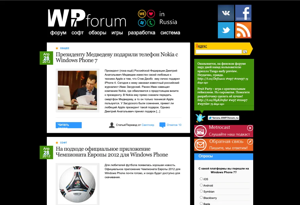 К весне 2012 года посещаемость выросла существенно. WP7forum.ru собирал вокруг себя всё больше активных людей. Жизнь сообщества бурлила, мы посещали официальные открытые и закрытые мероприятия. В то же время мы обрастали контактами в разных компаниях и прокачивали свои любительские журналисткие навыки. Это позволило дойти до того, что уже к середине 2012 года наш сайт цитировали ZDNet, The Verge, Neowin, WMPoweruser и многие другие сайты. Через год после первого поста в блоге я стал понимать, что у нас получилось.