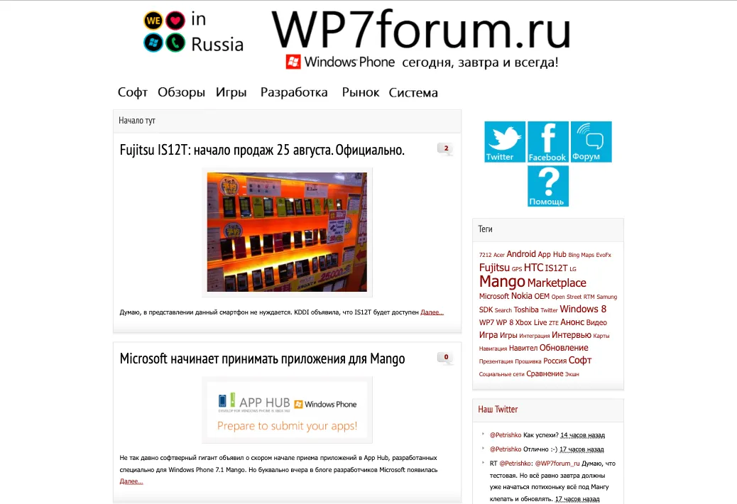 И вот Windows Phone 7 к июлю 2011 года Microsoft выпускает предрелизную сборку обновления с кодовым именем Mango. Я решаю, что форум с аккаунтом в Twitter – это очень классно, но нужно что-то более серьёзное. К производству смартфонов с WP7 присоединяется всё больше вендоров, а вместе с крупным обновлением в операционной системе появится русский язык. И я решил изменить формат WP7forum.ru. Вместо просто форума должен был появиться новостной блог, а форум должен был уйти на второй план. Я пару недель возился с Wordpress, пытаясь не сделать из подручных средств внешний вид блога в духе дизайна Metro. Насколько получилось, вы можете посудить сами по скриншоту ниже.